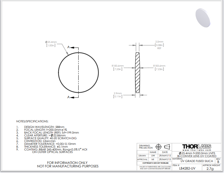 Thorlabs索雷博 LB4282-UV 双凸透镜